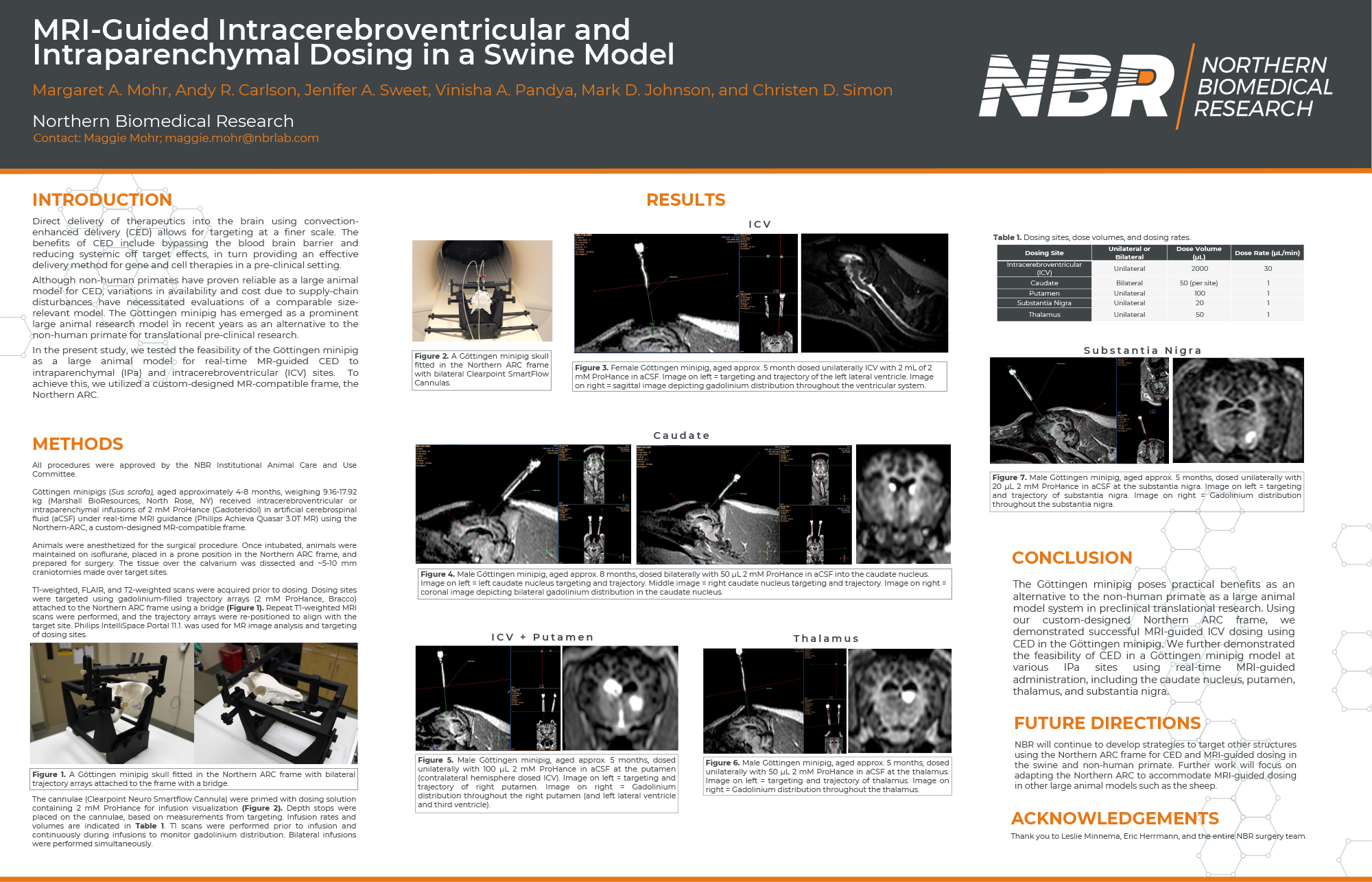NBR will continue to develop strategies to target other structures using the Northern ARC frame for CED and MRI-guided dosing in the swine and non-human primate. Further work will focus on adapting the Northern ARC to accommodate MRI-guided dosing in other large animal models such as the sheep.